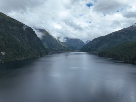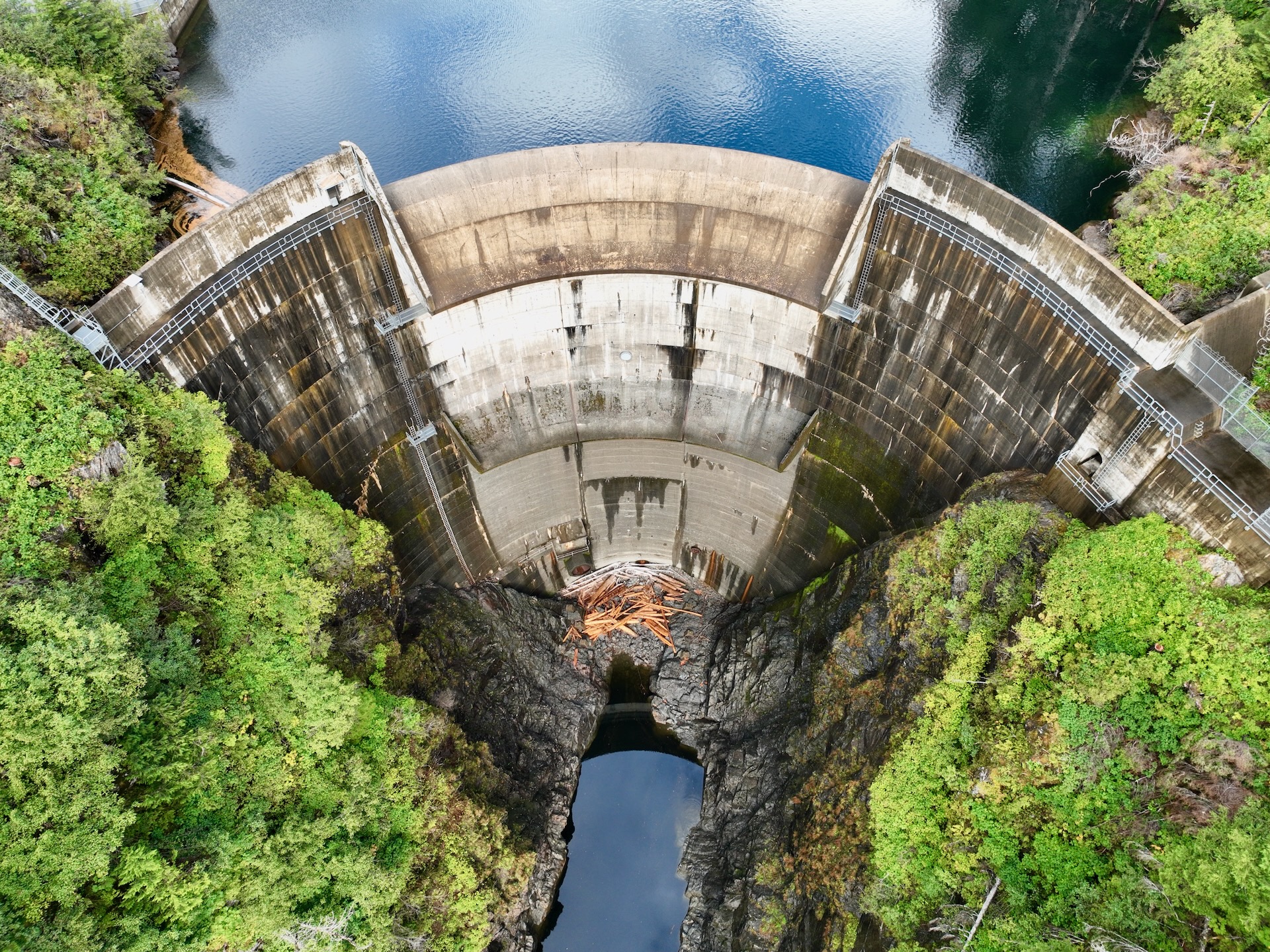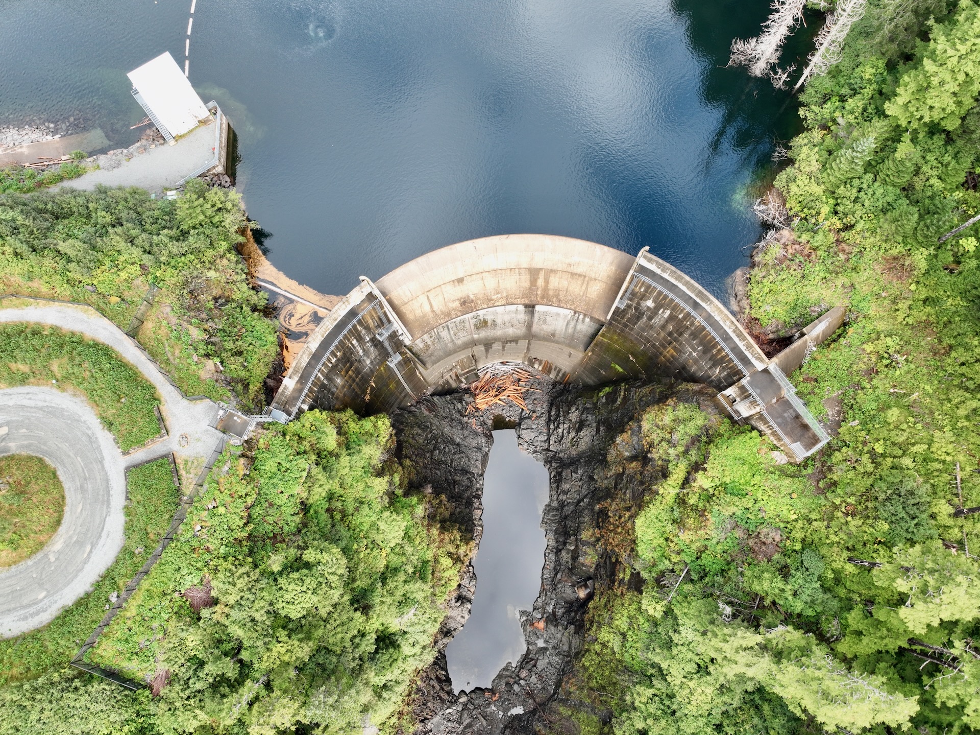 Flight over dam then looks down Blue Lake