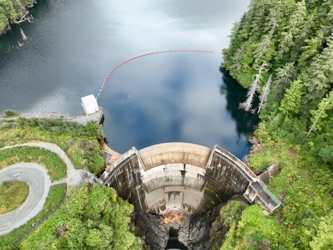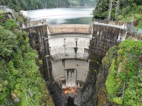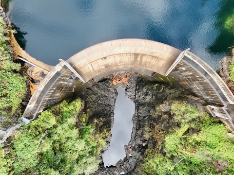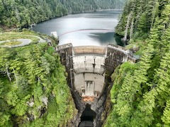 Flight looking down at dam then pans up looking south